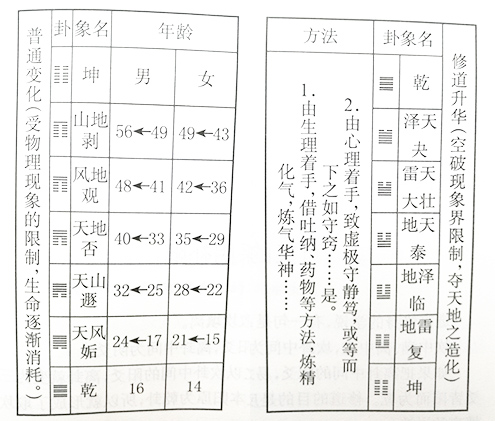乾卦是陽能,是生命的开始,乾卦的内卦是怀胎时期,外卦代表了出生后至十六岁(女十四岁)。从这个表上,我们可以看到,男子十六,女子十四以后,就进入后天的生命。